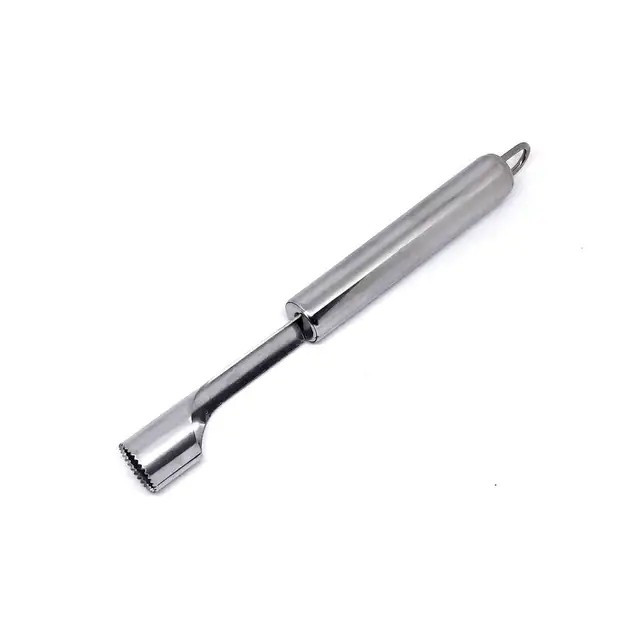 Видалення серцевини відбувається за рахунок вдавлювання ножа у фрукт з боку хвостика та прокручування його по всьому плоду. У Вас в руці залишається фпукт із наскрізним отвором, а серцевина його залишається на ножі. Ніж має хвилястий зубчастий край для кращого проходження. Також, з боку рукоятки є петелька для зберігання його у підвішеному стані з рештою приладдя. Загалом, дуже зручна, проста у використанні річ.